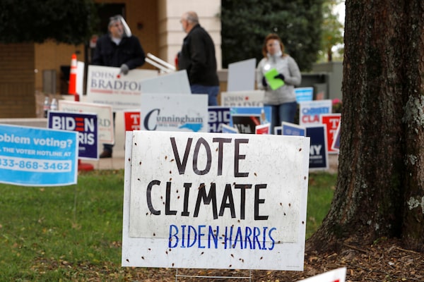A handmade sign stressing the importance of climate change as a political issue is seen outside a polling station on the last day of early in-person voting for the general elections in Cornelius, North Carolina on Oct. 31, 2020.JONATHAN DRAKE/Reuters
