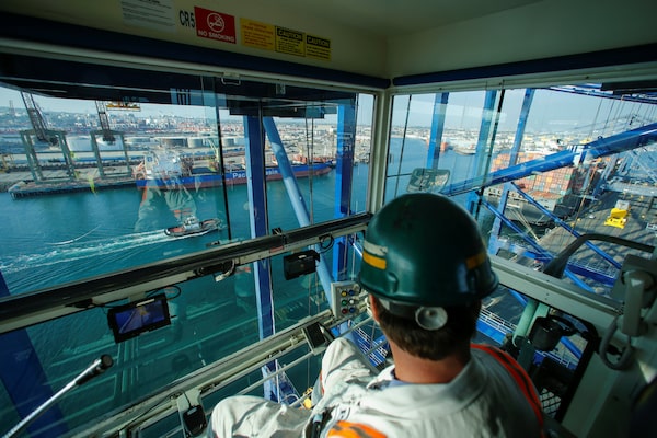 A worker operates a crane at the Port of Los Angeles. In the U.S., detailed manifest data is collected and updated daily, allowing the ports’ shippers and freight-forwarders to benefit from full transparency.MIKE BLAKE/Reuters