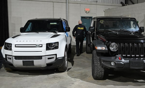 An OPP officer walks between two recovered stolen vehicles during a news conference announcing the seizure in Montreal, in April, 2024.Graham Hughes/The Canadian Press