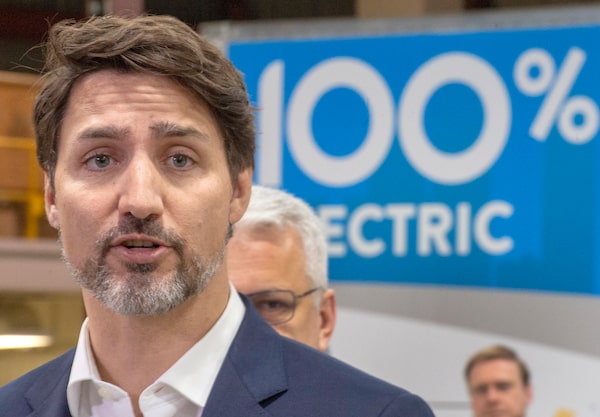 Prime Minister Justin Trudeau speaks to the media while touring the Lion Electric bus factory, Wednesday, March 4, 2020 in St-Jerome, Que. Ottawa is supposed to be steadily rolling out transportation electrification, among other things, but have been sidetracked by the coronavirus outbreak.Ryan Remiorz/The Canadian Press