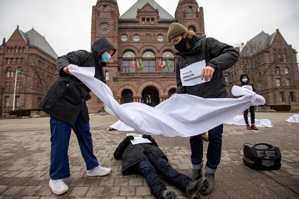Front-line workers stage a 'die-in' protest to demand paid sick days for all workers, in front of the Ontario provincial legislature at Queen's Park in Toronto, on Jan. 13, 2021.CARLOS OSORIO/Reuters