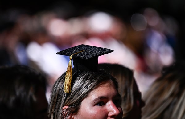 A bachelors of science graduate wears a headband featuring a miniature mortarboard cap as they attend their University of Ottawa convocation ceremony in Ottawa, on June 10, 2023.Justin Tang/The Canadian Press