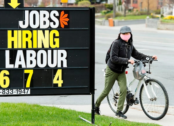 A woman checks out a jobs advertisement sign during the COVID-19 pandemic in Toronto on April 29, 2020.The Canadian Press