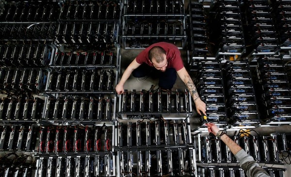 Bitcoin, the most popular cryptocurrency – employees working on bitcoin mining computers at Bitminer Factory in Florence, Italy seen here on April, 2018 – was worth US$9,475 in recent days and is expected to skyrocket this year.Alessandro Bianchi/Reuters