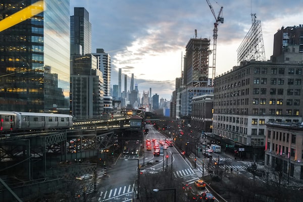 The Manhattan midtown skyline is in the background as cars move along the Queensboro bridge and a train rides by the Queensboro Plaza Station in the Queens borough of New York on April 1.CHARLY TRIBALLEAU/Getty Images