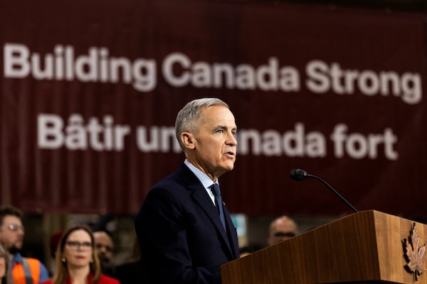Prime Minister Mark Carney speaks to the media after touring auto parts manufacturer Martinrea Industries in Woodbridge, Ontario, Feb. 5.Carlos Osorio/Reuters