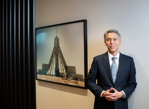 Mike Henry, CEO of Australian mining company BHP, stands beside a photograph of the company’s Jansen potash project, located in Saskatchewan, on Oct. 17, 2023.Fred Lum/The Globe and Mail