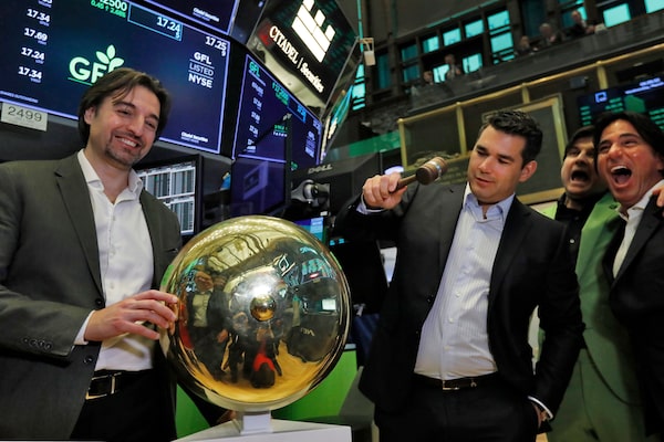 GFL Environmental founder, president & CEO Patrick Dovigi, second left, is joined by BC Partners' Paolo Notarnicola, left, as he rings a ceremonial bell on the floor of the New York Stock Exchange, on March 4, 2020.Richard Drew/The Canadian Press