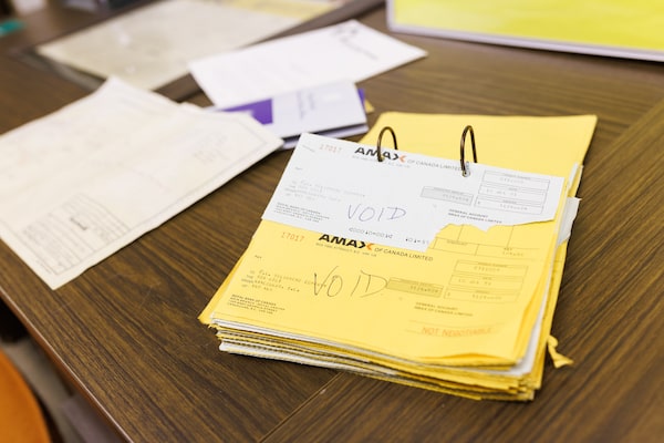 If Ottawa’s proposed rules are adopted, the only Canadians who will be able to open a chequing account are those who qualify for overdraft protection, have a strong credit rating, and no history of writing NSF cheques. Voided cheques sit open on a desk in a banker’s office in a shopping mall in Kitsault, B.C. on Sept. 21, 2023.Jesse Winter/The Globe and Mail