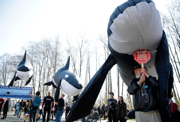Members of the Canadian Orca Rescue Society and others demonstrate against the expansion of Trans Mountain pipeline project, in Burnaby, B.C. on March 10, 2018.JASON REDMOND/AFP/Getty Images