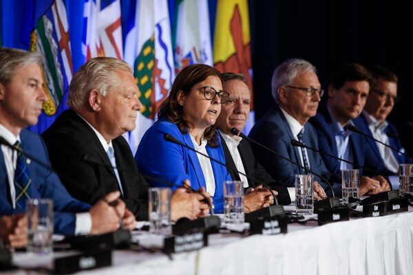 Heather Stefanson, third from left, Chair of the Council of the Federation and Premier of Manitoba, speaks to media during the closing news conference at the Council of the Federation Canadian premiers meeting at The Fort Garry Hotel in Winnipeg on July 12.JOHN WOODS/The Canadian Press