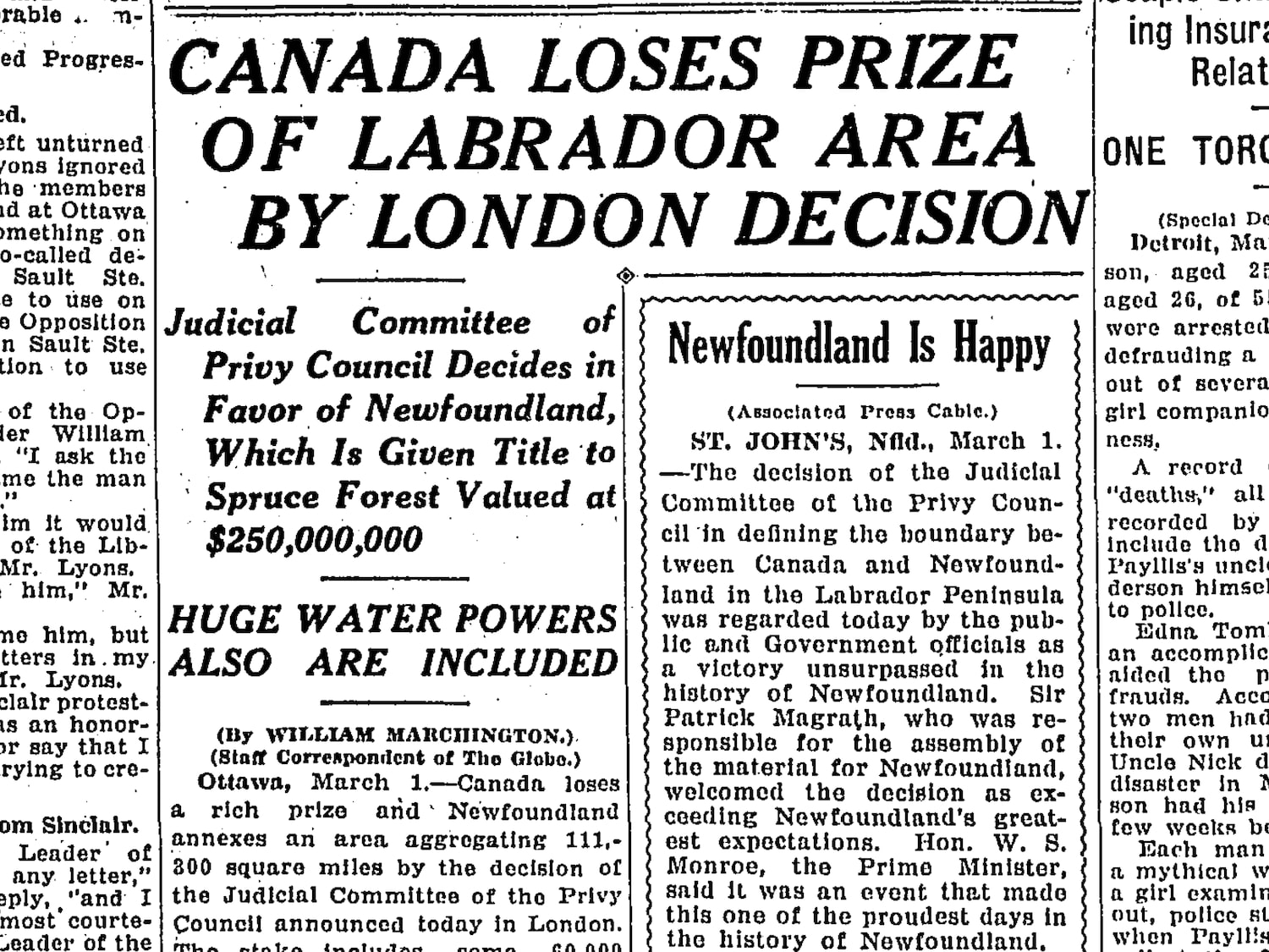 The implications of the JCPC decision were far-reaching. As The Globe and Mail noted in a front-page story at the time, Canada lost the “rich prize” of Labrador and its vast forestry and water resources because of “a London decision.”
