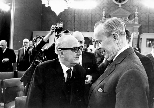 Newfoundland Premier Joey Smallwood, left, speaks to Prime Minister Lester Pearson on the first day of a federal-provincial conference on the constitution in Ottawa on Feb. 7, 1968.John McNeill/The Globe and Mail