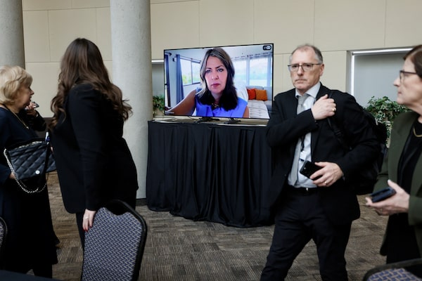 Alberta Premier Danielle Smith joins a meeting of provincial and territorial leaders Ottawa by video, on Jan. 15.Blair Gable/Reuters