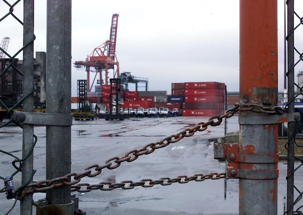 Containers and equipement sit idle behind a locked gate in Vancouver, on Nov. 8, 1999 amid a labour disruption at the Port of Vancouver.CHUCK STOODY/CP