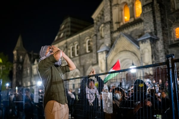 Protesters chant outside of a pro-Palestinian encampment set up on the University of Toronto campus in Toronto on May 2.Christopher Katsarov/The Canadian Press