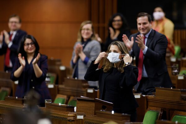 Canada's Finance Minister Chrystia Freeland removes her protective mask before speaking in the House of Commons after unveiling her first fiscal update, the Fall Economic Statement 2020, in Ottawa on Nov. 30, 2020.BLAIR GABLE/Reuters