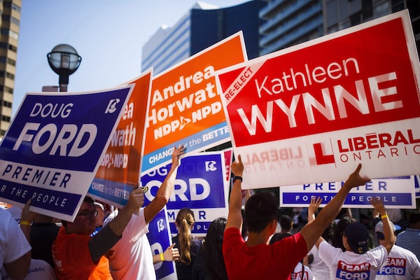 People hold signs ahead of the Ontario Elections Leaders debate at the CBC building in Toronto, Sunday May 27, 2018.Mark Blinch/The Canadian Press