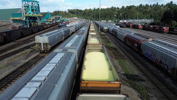 A drone view shows loaded freight rail cars sitting in a Canadian National Railway Co. yard in North Vancouver on Aug. 22.Jesse Winter/Reuters