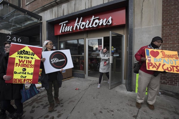 A customer exits a Tim Hortons in Toronto as protesters rally over its treatment of workers after the minimum wage in Ontario was increased.Fred Lum/The Globe and Mail