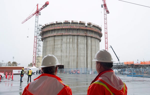 Construction workers look on at the FortisBC Tilbury LNG expansion project in Delta, B.C., in November, 2015.JONATHAN HAYWARD/The Canadian Press