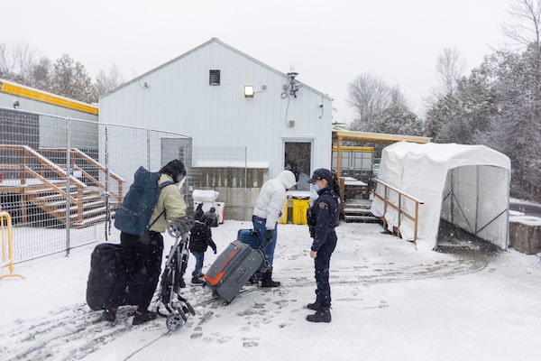 A family crosses into Canada at Roxham Road, an unofficial crossing point from New York State to Quebec for asylum seekers, in Champlain, New York, on March 25.CARLOS OSORIO