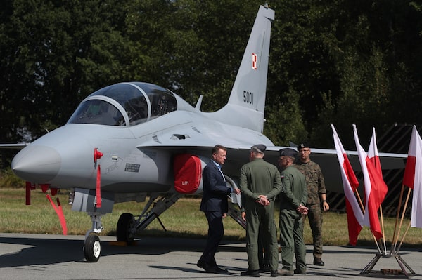 Polish Defence Minister Mariusz Blaszczak meets pilots during a press conference to present the recently purchased South Korean FA-50 light combat aircraft at the Polish Airforce base in Minsk Mazowiecki, in August, 2023. The country purchased 48 of the aircraft for more than US$3 billion.KACPER PEMPEL/Reuters