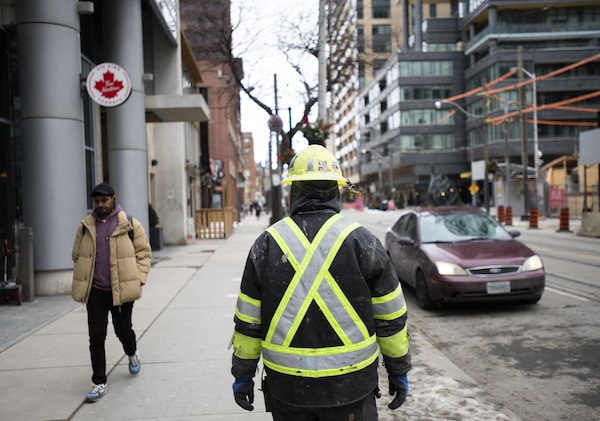 A construction worker walking on King St. West in Toronto on Mar. 14.Fred Lum/the Globe and Mail