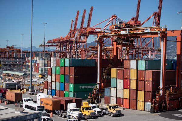 Trucks hauling shipping containers wait in a queue at the Port of Vancouver, on Sept. 3, 2020.DARRYL DYCK/The Globe and Mail