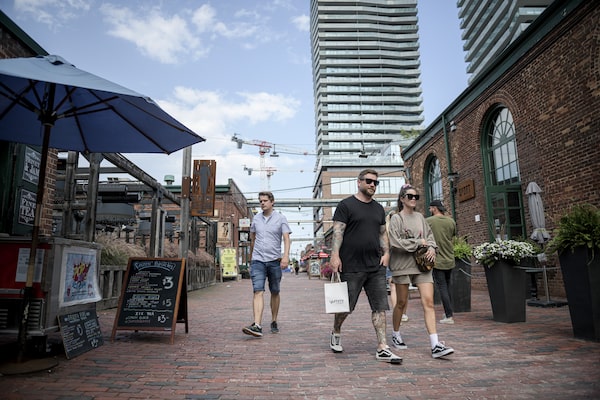 People walk with shopping bags through the Distillery district in Toronto.Christopher Katsarov/The Globe and Mail
