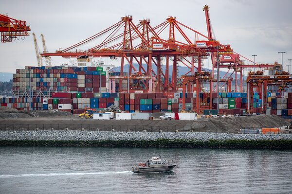 Shipping containers sit stacked below gantry cranes at the Port of Vancouver on March 1, 2021.DARRYL DYCK/The Globe and Mail