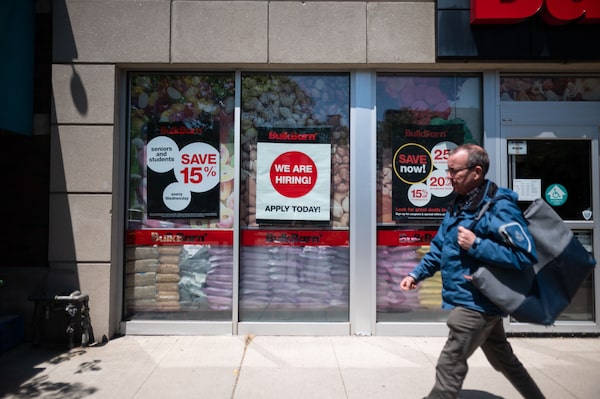 A pedestrian walks past a hiring sign on display at shop in Toronto.Tijana Martin/The Globe and Mail