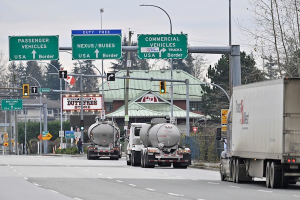 Commercial trucks head towards the U.S. Customs and Border Protection (CBP) Pacific Highway Port of Entry from south Surrey, B.C., in November, 2024.Jennifer Gauthier/Reuters