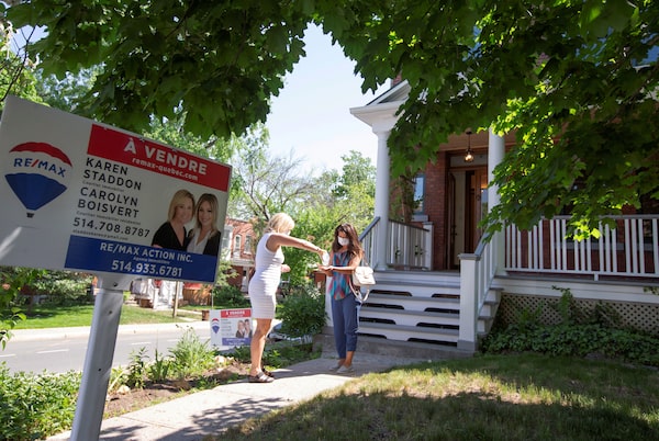 A client has her hands sanitized by a real estate agent following a visit to a home in Montreal on June 5, 2020.Christinne Muschi/Reuters