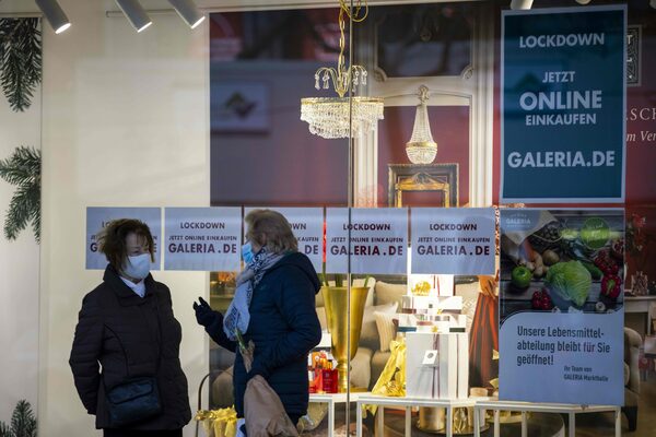Two women speak outside a closed department store in Berlin on Jan. 5, 2021.ODD ANDERSEN/AFP/Getty Images