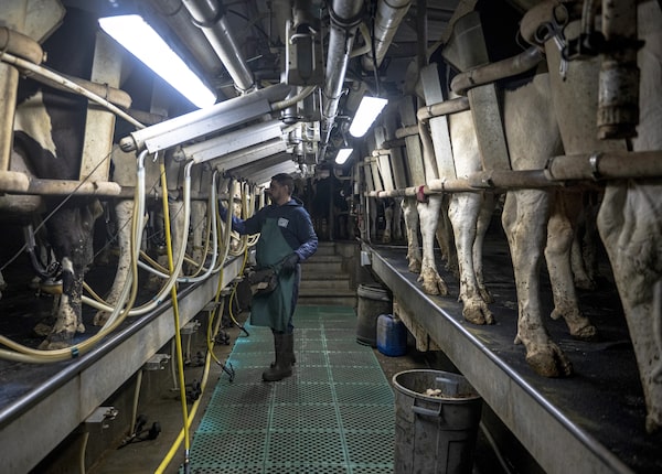 A worker milks the dairy cows in the milking area at Ferme Isabelle, a member of Agropur, in Coteau-du-Lac.Andrej Ivanov/The Globe and Mail