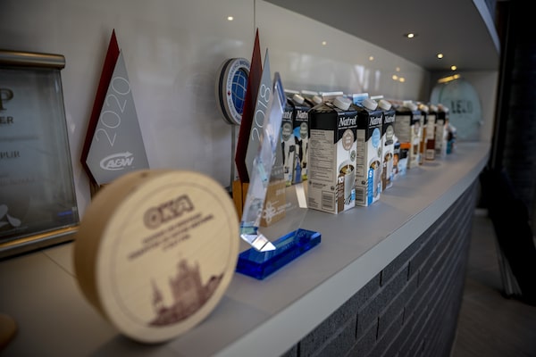 Milk cartons, dairy product packages and, awards are seen at Agropur's facility in Saint-Hubert.Andrej Ivanov/The Globe and Mail