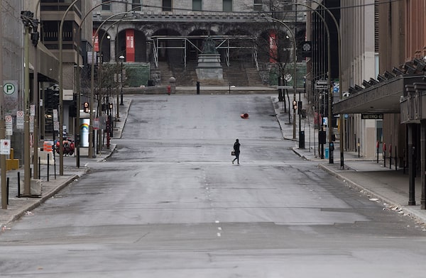 A woman crosses a street in downtown Montreal on April 5, 2020.Graham Hughes/The Canadian Press