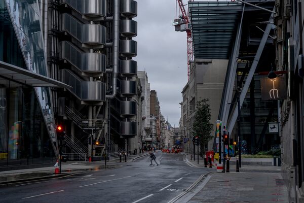 A skateboarder crosses a street in London’s nearly deserted financial district on Jan. 5, 2021.ANDREW TESTA/The New York Times