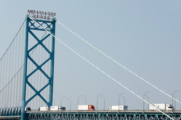 Commercial trucks cross the Ambassador Bridge, a key trade artery between Canada and the U.S. While most Canadian goods exports are still entering the U.S. duty-free, the U.S. has targeted several industries with its tariffs, including steel, aluminum, automobiles and lumber.JEFF KOWALSKY/AFP/Getty Images