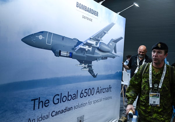 Attendees pass an image of the Bombardier Global 6500 Aircraft at the CANSEC trade show in Ottawa in 2023.Justin Tang/The Canadian Press