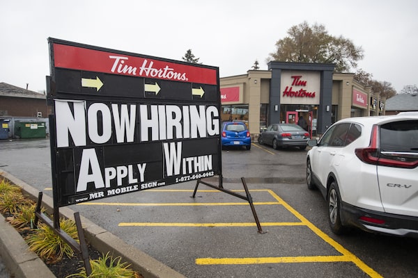 A large sign advertising that Tim Hortons is hiring, is photographed outside the Tim Hortons restaurant at Donlands Avenue and O’Connor Drive on Nov. 25, 2021.Fred Lum/the Globe and Mail