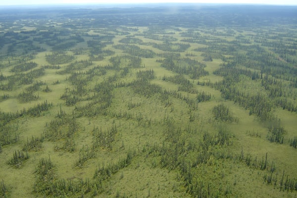 The McClelland Lake complex, about 90 kilometres north of Fort McMurray, comprises two large patterned fens – peat-producing wetlands featuring long strings of trees and shrubs separated by narrow pools. Its 60 square kilometres host 12 sinkhole lakes, a rare landform created by the collapse of lower rock layers.