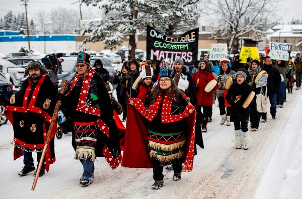 Wet'suwet'en Hereditary Chiefs from left, Rob Alfred, John Ridsdale, centre and Antoinette Austin, who oppose the Costal Gaslink pipeline take part in a rally in Smithers B.C., on Friday January 10, 2020.The Canadian Press