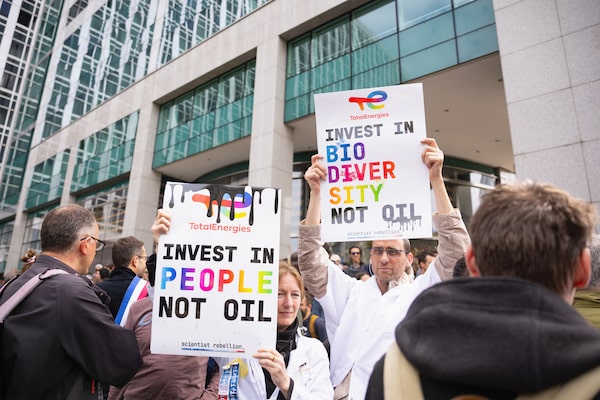 Environmental activists from Scientist Rebellion hold placards during a protest in front of the offices of asset manager Amundi, in Paris, on May 24.ANTONIN UTZ/Getty Images