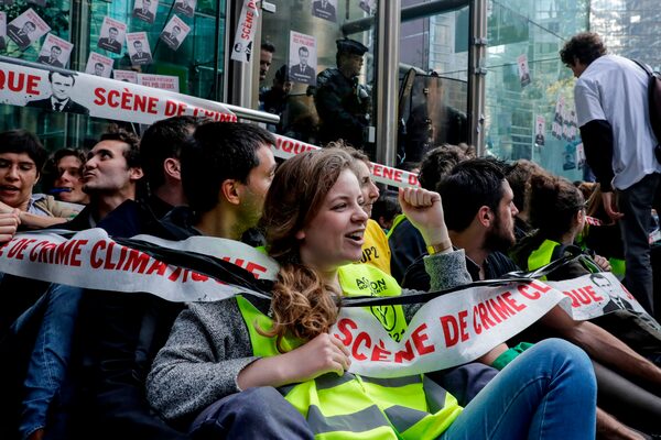 Climate change activists block the entrance of the Societe Generale bank headquarters in La Defense, near Paris, during an environmental protest called by the NGO Extinction Rebellion, on April 19.THOMAS SAMSON/AFP/Getty Images