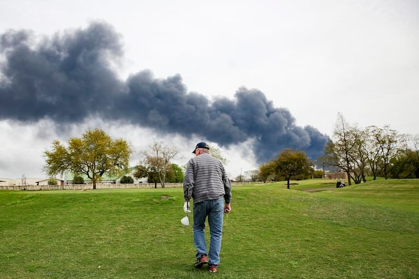 Mike Tipton of Santa Fe, Tex., gets ready to tee off at the Battleground Golf Course while smoke from a petrochemical fire blackens the sky on March 18, 2019.The Canadian Press