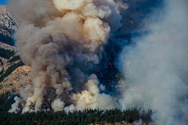 A plume of smoke rises as the Jasper Complex Wildfire burns in Alberta on Aug. 14.L Neufeld/Parks Canada/Reuters