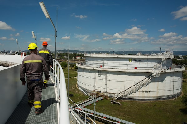 Workers walk around one of one of the silos that stores petroleum inside the Slovnaft Oil Review, in Bratislava, Slovakia, on May 31Zuzana Gogova/Getty Images