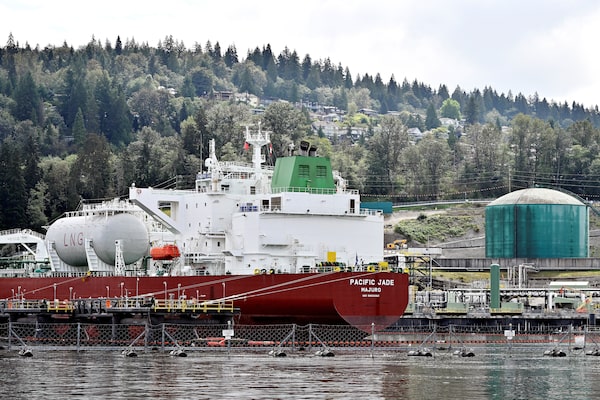 A crude oil tanker at the Westridge Marine Terminal, the terminus of the Trans Mountain pipeline expansion project in Burnaby, B.C., on Aug. 25.Jennifer Gauthier/Reuters